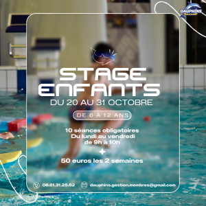 Nous vous informons que le club des Dauphins d’Obernai proposera un stage à destination des enfants du lundi 20 au vendredi 31 octobre 2025.